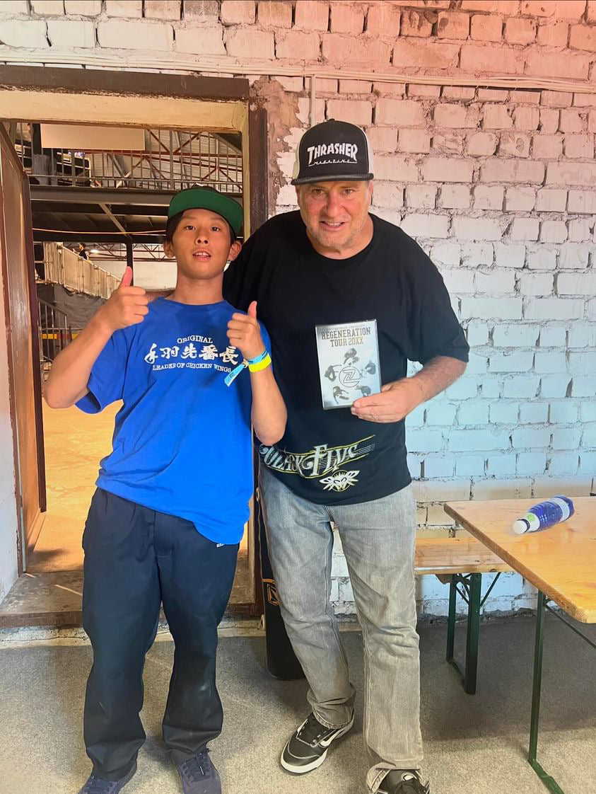 決勝中にビッグなTail dropをメイクして会場を沸かしていたGreyson FletcherにREGENERATION TOUR 20XXのDVDを渡して記念撮影。